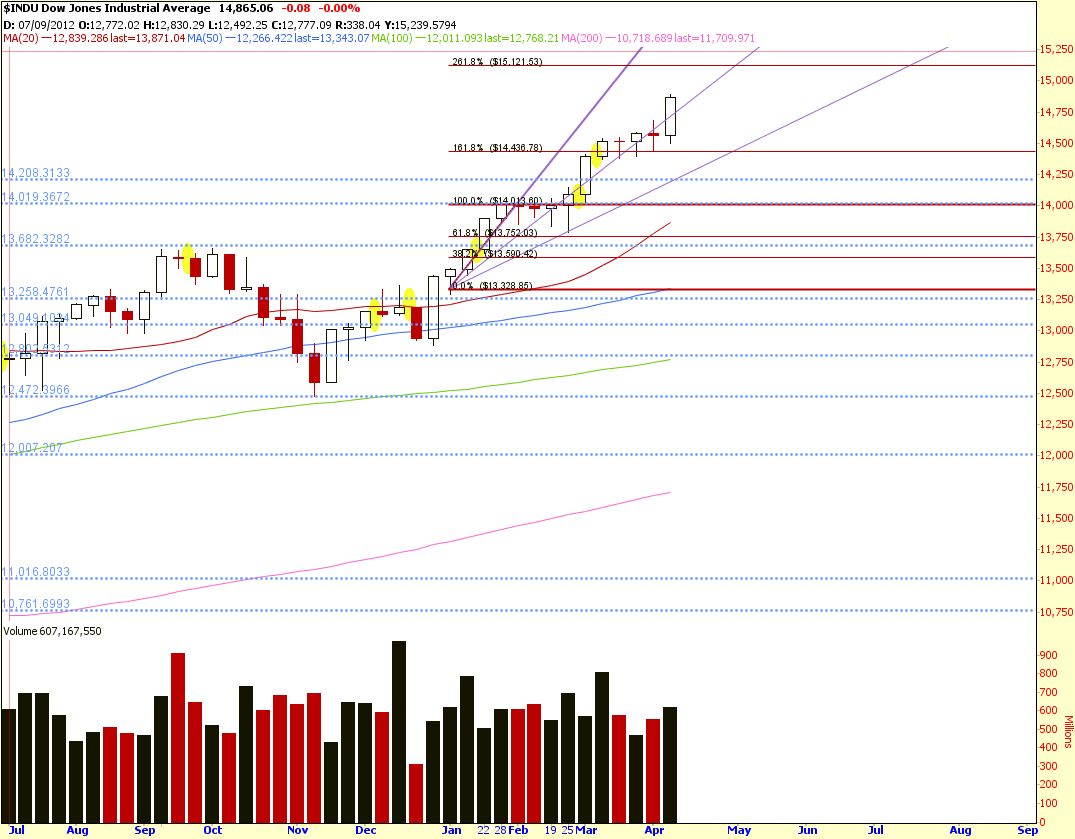 The market came under pressure at the start of the day with Wells Fargo and JP Morgan's earnings not quite up the expectation. As I expected.. It was really a volatile session and we ended flat for the trading day. Wells Fargo and JP Morgan managed to beat the bottom line expectation but the revenues fall. Due to much cost cutting in the financial sectors, I won't consider the results fantastic. While Monday we have Citi announcing their earnings before market open. I believe 3 of the major banks earnings will be able give a good snapshot on how the financial sector is going to perform already. While on the internals, we're able to have quite a bit of volumes at 657Mil shares traded on the NYSE and the DVOL managed to outpaced the UVOL by 2:1. While we're having the flat day, the main leader for the day was Consumer Discretionary while the Materials and Energy lagging each more than 1.3%. So it's more of a down day than a flat day. While on the technical side, the Dow is showing a hanging man which signifies the end of trend already, however, a little divergence from the weekly charts, where all 3 indices are showing bullish candlestick formation. That is definitely a sign that the market is going to go through a volatile period, especially through this earnings season. From the 9 main sectors movements, we can see that the defensive sectors are outweighing the important sectors like Financials and Tech. If anymore other Dow components are not performing well for their earnings, I'm expecting the Sell-in-May to come early. While on the commodities, Oil sunk below $90 per barrel at the start of trading session on Monday as other Asian markets are being hammered. On top of that, precious metals had a rough session on Friday as well. Seems that Precious metals are not exactly a 'safe haven' anymore right? Nonetheless, we're not going to have much data coming out on Monday, so the centre of gravity will lies on Citi's earnings.