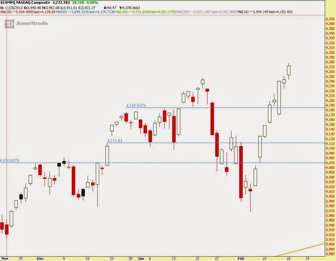 The market held flat at the top as Nasdaq composite broke into a new high once again. After a rally on Valentine's Day, and together with the long weekend, the market started to hold back a little ahead of the FOMC minutes today and 2pm ET, and Yellen's second testimony which was postponed from last week Congressional hearing to tomorrow, without any specific time yet.